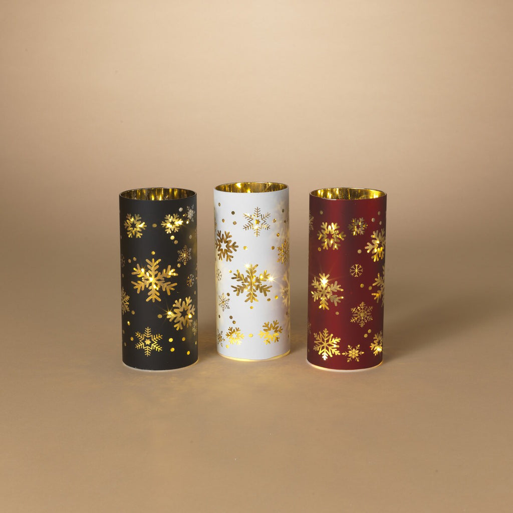 Set the scene with this elegant luminary piece. This piece comes complete with LED warm lighting, and a snowflake scene on different colors.  It looks beautiful at night, but also unlit during the day.