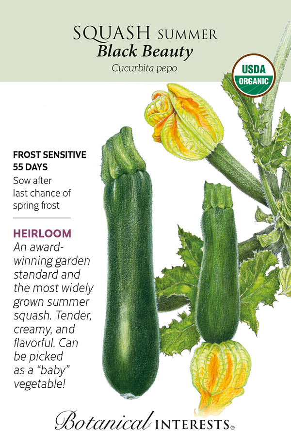 Zucchini is one vegetable that just won't quit! This highly productive bush-type heirloom from the 1920s takes up little garden space. Dark green, shiny fruits with tender skin are very versatile in the kitchen. Can be steamed, sautéed, added to soups, omelets, and breads, made into relish, and eaten raw in salads or with dip. See inside of packet for zucchini relish recipe. 'Black Beauty' is a 1957 All-America Selections award winner.