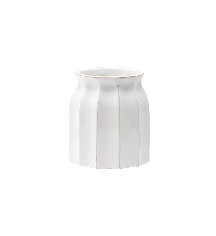 Make a statement with the White Beige Wide Ribbed Vase.  This elegant vase features a ribbed motif that is displayed all around the container. It can be used as a vase for fresh flowers, or a container for silk flowers.